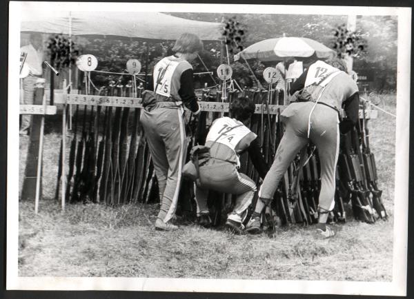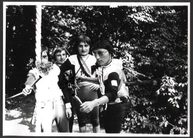 Porada soutěžící skupinky před dalším náročným úkolem. Podle vzpomínek pana Sedloně jednalo se o přeskočení potoka. Zvláště si všimněte borce uprostřed jak jeho ruce v bok a napjatý výraz v obličeji svědčí o vysoké vyhoukanosti před koncentrací na následující úkol.