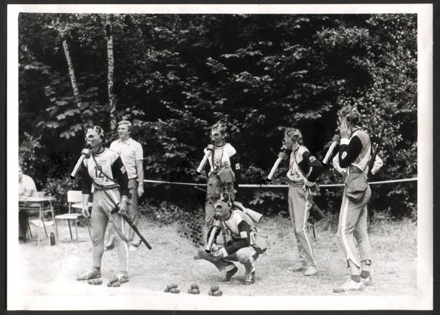 Finální disciplína. Kouření třístovkového džojnta skrz filtr na plynové masce. Nejnebezpečnější a nejvyčerpávající úkol. Na závodníkovi vpravo je dobře vidět, že mu maska netěsní a proto se snaží zabránit unikání kouře vlastními silami. Komise vlevo hodnotila eleganci kouření a samozřejmě řídila časomíru. Na této fotografii je výborně patrná tehdejší huličská móda sovětských tepláků a slušivých deček s čísly.
