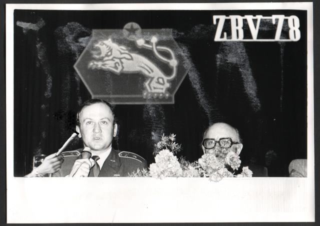 Fotografije ze závěrečné kalby. Vlevo je vidět ruka soudruha ze Sovětského svazu Vladimira Kosti Ivanoviče jak podává džojnta zcela vysmaženému zástupci armády, štábnímu kapitánu Františku Š. Na jeho výrazu ve tváři je patrné, že v armádě se tenkrát moc nehulilo a že je příjemně překvapen magickými schopnostmi mikrofónu. Zcela vpravo, ukryt za qětinami, je prezident republiky soudruh Gustáf H., těsně po návratu ze státnické cesty po Indii. Květiny tam umístila jeho ochranka, protože před vstupem na pódium si dal čaras a na stole si hrál s angličáky. Stejně hulí kdo může.