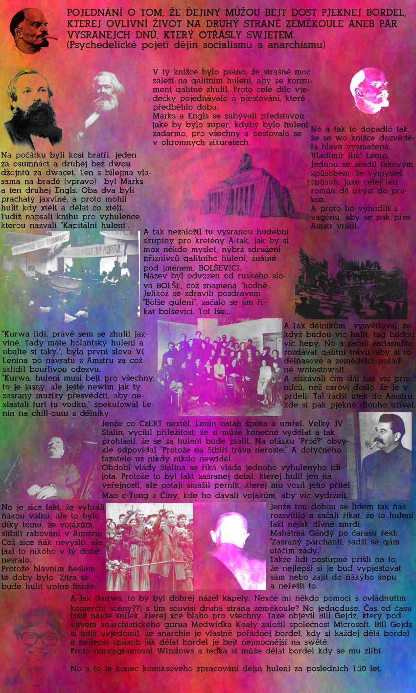 Po Po Pondělí 28.05.2001 13:26 Tak tenhle weekend byl fakt pjekně hustej. Ráno sem vstal, přijel do školy, sednul k počítači a v tu ránu se na moji maličkost sesypalo aspoň milijón vjecí. 337mejlu z konference a různejx lidí, 17správ na ICQ během asi 5 minut (za to může UFO, což za xvíli objasním) a JIMMYmu nestartujou Yksa. Vyvrcholení nastalo v okamžiku, kdy přišel P. s tím ať se dohodnem, kdy budou zkoušky. V této sekundě mi všechno uteklo a přestal jsem stíhat. Tákže je potřeba to vzít pjekně od začátku. Koukám na logy přistupů a dost hustý. Skoro 360lidí. A hlavně dva nedočkavé z domény mafra.cz. Ano, milá I., UFO skutečně eksistuje. Možná, že si tomu doteďka nevěřila, ale opravdu UFO eksistuje. Kdo neviděl, neuvěří, ale myslím, že ty jsi viděla... :))))) A taxi z toho nic nedělej, prostě se to občas děje. Vím o čem mluvím, horší by však byl únos. Proto asi chápeš, proč je v americe díky jejich protidrogové politice tolik spatření neznámých létajících předmětů. Lidi totiž choděj smažit do pouště, ánžto je tam klid a mír. Proto je v poušti (zvláště v území Area51 - tam nejspíš hodně rostou kaktusy...) tolik UFOnů ke spatření.... Takže vidíte, jaxem si užil weekend. Pohoda klidek a hlavně pořádnej hukot... Takže v sobotu večer sem se tak ňák probral doma, najed se a vyrazil na zahradní garden party (resp. sešel ze schodů). Kromě nějakého obligátního popíjení alkoholických nápojů, jehož sem se zůčastnil minimálně, pečení buřtů (na to sem se vysral úplně) a kouření marihuany (to sem si užil pjekně na maks) se nic nedělo. Akorát sem konečně slyšel od F. jeho story se konopným mlíkem. A to je podle mne nejdůležitější zážitek celého weekendu. Táákže jak to bylo... Před ňákejma třema rokama sme byli kalit v Jablonci. Sem si tam dělal mlíko s konopným listím, a paxem si pjekně hučel. Přičemž sem tam pár lidem vysvětloval, jak je to super hustý. Asi o rok později si F. zasadil jedno semínko, a aby to čert nextěl, tak mu vyrostlo fakt hodně hustý hulení. No a milej F. si takhle jednou v listopadu vzpomněl na to co sem mu vyprávěl, a taxi svařil litr mlíka se vším listím (včetně několika palic). No vyprávěl, že si s tím dal pjekně práci, hlídal, aby to nepřeteklo, nechal skapávat vysráženou vodu nazpět do mlíka a ve finále to pořádně nechal odstát. Paxi nalil do kafáče, posadil k televizi a vypil to. (Zvědavost ho donutila překonat tu celkem nechutnou chuť). A tak seděl a řikal si (zhruba citát) "zase ti feťáci kecaj, to je ňákej blud", a taxi dal ještě asi tři hrníčky navíc. Od týfky odcházel s takovým tím, pocitem, že zase na huliče vyzrál, že sou pjekně ukecaný a šel si lehnout. Zhruba asi po hodině to přišlo. Nejdřív se mu zvednul tlak jaxvině a v tu xvíli si prej uvědomil, že je něco špatně. Vstal, aby sklidil stopy, umyl nádobí, vylil asi půllitr mlíka do záchodu a šel ležet. V tu xvíli to vypuklo, kromě toho, že mu bylo vedro jaxvině, hlavou se mu honily hodně hustý věcí, tak ta tráva zaútočila hnedka s haluškama. Prostor se vlnil a pohyboval. Taxe vydal do koupelny, aby si dal studenou sprchu. Což sice na xvíli pomohlo, ale jaxi zase lehnul a teplota se upravila, hustej staf se vrátil. Myšlenky se zaměřily pouze na to, aby se toho zbavil (jenže každá smažka dobře ví, že to odezní až za určitej čas). A tak tak bloudil po baráku, svlečenej do naha, pootvíral všechny okna a dveře, aby bylo v baráku chladno. Vygradovalo to nakonec tak, že vyběh před barák a pobíhal (nejpíš nahej - to se mi přesně nepodařilo zjistit) okolo, haby si schladil organismus. Po nějakým čase (sám neví, jak dlouho to trvalo) začal přemejšlet, že by někoho zawolal na pomoc. Jenže jak ten mozek šrotoval, taxi uvědomil co by případnejm doktorům říkal, že by z toho byl průser jaxvině, a taxe na to vysral a šel si lehnout s pocitem, že to snad přežije. Večer se vrátila jeho matka a hnedka uhodila "proč sou jako votevřený všechny dveře a wokna v celým baráku" (protože jaxi hučel, tak sice sklidil důkazy, ale zapomněl na detaily jako sou okna, dveře a ták - však to asi znáte). Won jí vysvětlil, že je mu fakt hodně zle a nakonec prospal skoro dva dny, aby se probudil do krásného nového dne. Jo, a pakže i po hulení nemůže bejt trip jaxvině.... :)))) Ááááx a to bude všechno, potřebuju ještě psát pro koukat.cz, ánžto to ňejak nestíhám.... Kdo si počká, ten se džojnta dočká.